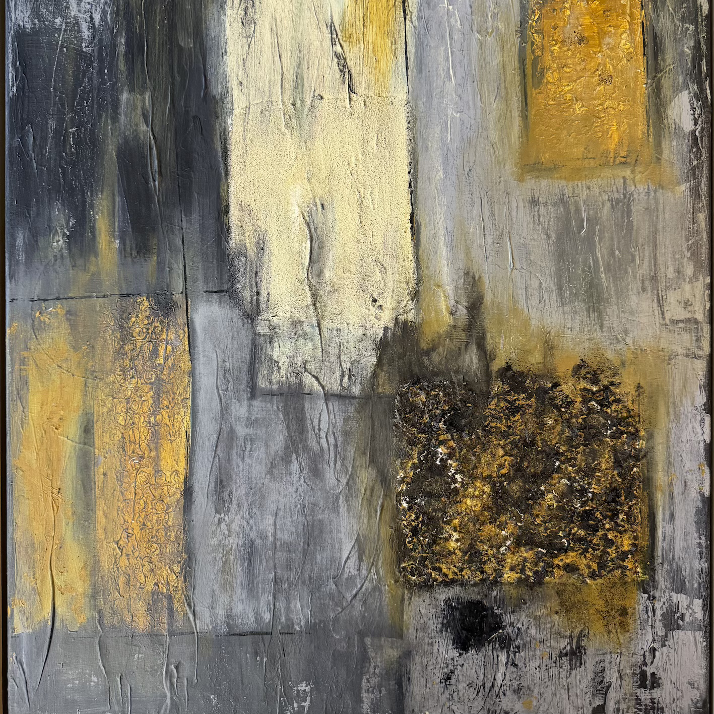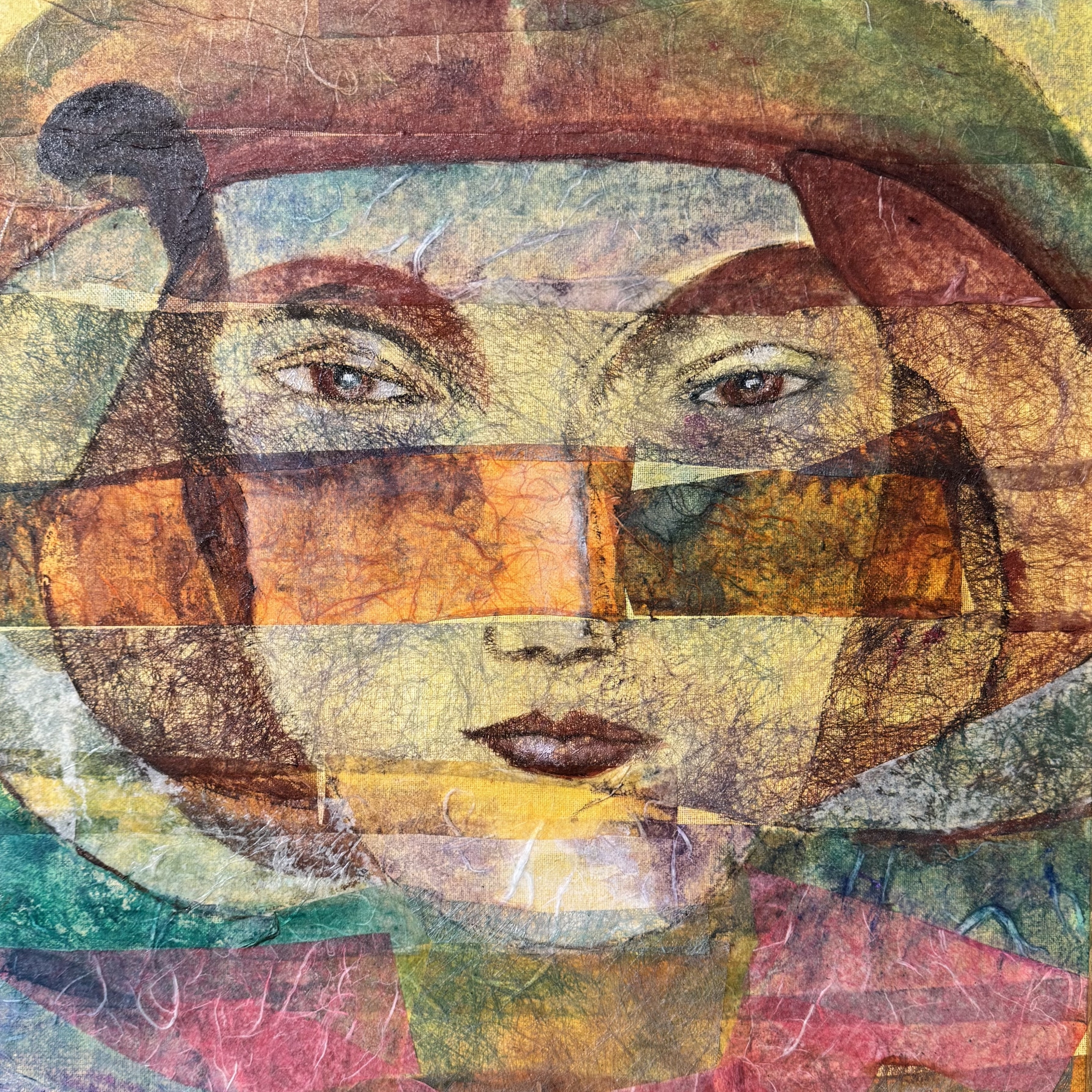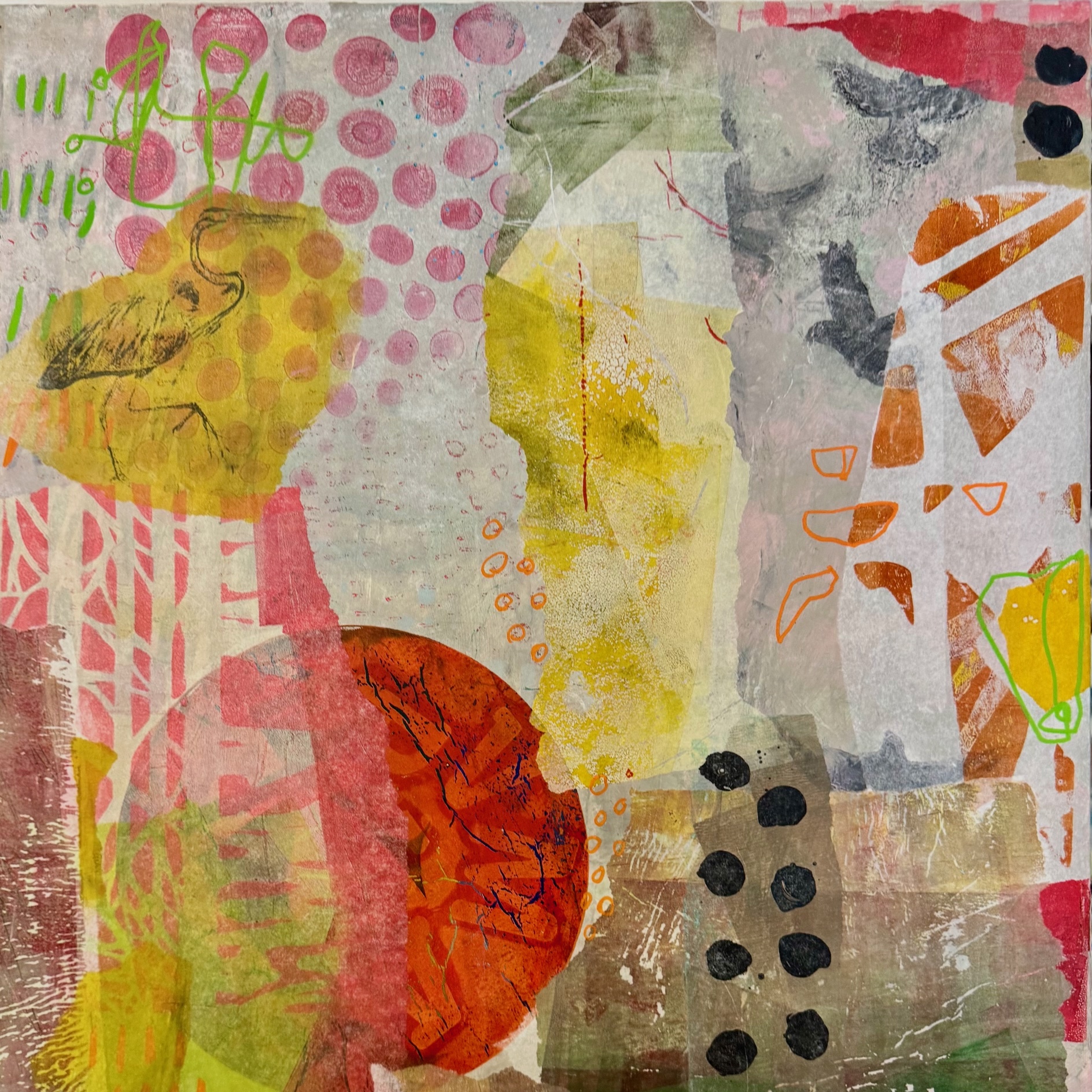 Monique maakt collages van acryl gedrukte monoprints op rijstpapier. Vorm, kleur en ontwerp zijn intuïtief en modern weergegeven op canvas of houtboard.